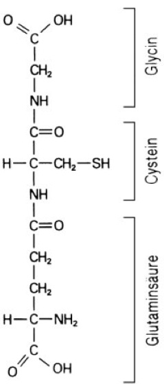 Glutathions [von latein. gluten = Leim, griech. theios = Schwefel], Abk. GSH, E glutathione, schwefelhaltiges Tripeptid (γ-Glutamylcysteinylglycin; siehe Abb. ), das wegen seiner Thiolgruppe und der γ-Glutamylbindung eine Fülle von biologischen Funktionen besitzt, die Entgiftungsreaktionen, Strukturbildung von Proteinen, Coenzymfunktionen, Reparatur von DNA-Schäden, Beeinflussung des Zellmilieus und damit Beteiligung an Entwicklungs- und Alternsprozessen (Altern) umfassen. Es steht in der Zelle im Gleichgewicht mit dem Glutathion-Disulfid GSSG, das als Oxidationsprodukt entweder durch katalytische Wirkung einer Selen-haltigen Glutathion-Peroxidase entsteht, wobei im Stoffwechsel anfallendes H2O2 reduziert wird, oder in einer Transhydrogenierung gebildet wird. Weiter kann GSSG durch Wirkung freier Radikale entstehen oder extrazellulär durch spontane Oxidation unter Bildung von H2O2. Eine NADPH-abhängige GSSG-Reductase katalysiert die Rückreaktion zu Glutathion. Normalerweise wird dadurch der GSSG-Gehalt der Zelle weit unter 10% gegenüber der reduzierten Form gehalten. – Zahlreiche exogene (Medikamente, Umweltgifte) und endogene (z.B. Prostaglandine und Leukotriene) Substanzen werden mit Glutathion konjugiert. SH-Gruppen von Proteinen werden durch Glutathion vor Oxidation geschützt. Durch die Spaltung von Disulfidgruppen und die enzymatische oder nicht-enzymatische Oxidation zu GSSG wirkt Glutathion als wichtigstes nicht-enzymatisches Antioxidans (Antioxidantien) und schützt die Zelle vor dem Angriff freier Sauerstoffradikale. Damit im Zusammenhang steht eine entscheidende Mitwirkung bei der Aufrechterhaltung eines definierten Redoxpotentials in der Zelle, wie es für Entwicklungs- und Differenzierungsprozesse unabdingbar ist. Glutathionmangel bzw. Defekte von Enzymen des Glutathionstoffwechsels führen zu einer Reihe von Erkrankungen, z.B. Degenerationen im Zentralnervensystem, Polyneuropathien und Myopathien. Bei der Parkinson-Krankheit findet sich eine Reduktion des Glutathions in der Substantia nigra pars compacta.