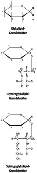 Grundstrukturen von Glykolipiden und ihren Unterklassen, den Glyceroglykolipiden und den Sphingoglykolipiden. Gezeigt wird ein Ausschnitt des glykosidischen polaren Molekülteils. R' und R'' Kohlenwasserstoffketten; Y nichtpolarer Rest.