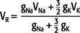 Benutzt man das verallgemeinerte Ohmsche Gesetz, so erhält man mit den Leitfähigkeiten gNa und gK (anstelle der Permeabilitäten in der GHK-Strom-Gleichung) als "steady-state equation" für das Ruhepotential obenstehende Gleichung. VNa und VK sind die Gleichgewichtspotentiale, die ihrerseits, laut der Nernst-Gleichung, von den Quotienten der Ionenkonzentrationen im Ruhezustand abhängen. 3/2 ist das Verhältnis der von der Natrium-Kalium-Pumpe transportierten Natriumionen zu Kaliumionen.