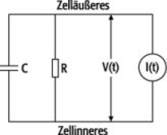 Integrate-and-Fire-Neuron, Lapique-Modell, Leckintegrator,E integrate and fire neuron, einfaches Neuronenmodell, das den Zeitverlauf des Membranpotentials einer Nervenzelle und die Auslösung von Aktionspotentialen beschreibt. Die gesamte Zellmembran stellt eine Äquipotentialfläche dar, die durch die momentane Abweichung V(t) vom Ruhepotential zur Zeit t charakterisiert ist. Aus dem Ersatzschaltbild ( siehe Abb. ) ergibt sich für V(t) unterhalb einer Feuerschwelle x (Schwellenpotential) die Gleichung