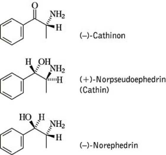 Kath, Kat, Khat, Zweigspitzen und junge Blätter des in Ostafrika und im Jemen wachsenden Kath-Strauchs, Catha edulis, die in frischem Zustand gekaut werden. Kath-Kauen führt zu einer Erhöhung der psychischen Leistungsfähigkeit, einer Verminderung des Schlafbedürfnisses und des Hungergefühls bei gesteigerter Motorik. Besonders begehrt ist jedoch die euphorisierende Wirkung der Droge (Rauschgifte). Hauptwirkstoffe des Kath sind das zentralstimulierende Cathinon [S-(-)-α-Aminopropiophenon] und die durch Reduktion daraus entstehenden Substanzen Cathin [(+)Norpseudoephedrin] und (-)-Norephedrin ( siehe Abb. ). Cathinon fördert die Freisetzung von Dopamin, Noradrenalin und Serotonin und ähnelt damit dem Amphetamin. Bei chronischem Mißbrauch von Kath sind Langzeitschäden zu verzeichnen. Hierzu gehören unter anderem eine starke Abmagerung, Schädigungen der Verdauungsorgane, der Leber und Nieren sowie ein psychischer Verfall bis hin zum Wahnsinn.
