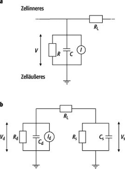 Kompartiment-Modelle,E compartmental models, eine Klasse von Neuronenmodellen, welche die elektrischen Eigenschaften von Nervenzellen unter Berücksichtigung ihrer räumlichen Struktur mehr oder weniger detailliert durch RC-Glieder beschreiben, die über Widerstände miteinander gekoppelt sind. Das Ersatzschaltbild eines einzelnen Kompartiments als Baustein eines Kompartiment-Modells ( siehe Abb. a ) ist durch eine zeitabhängige Spannung V charakterisiert, die die Abweichung vom Ruhepotential darstellt. Obendrein ist es möglich, durch Einführung einer Feuerschwelle (Schwellenpotential) die Auslösung von Aktionspotentialen zu berücksichtigen (aktives Kompartiment). Der einfachste Fall ist das Integrate-and-Fire-Neuron, das aus nur einem aktiven Kompartiment besteht. Abb. b zeigt ein Zwei-Kompartiment-Modell, bei dem ein Kompartiment dem Soma (Perikaryon) und das andere dem Dendritenbaum entspricht. Prinzipiell läßt sich eine beliebig komplexe neuronale Morphologie in ein Kompartiment-Modell umsetzen; dabei werden die Kapazitäten und Widerstände gemäß den elektrischen Eigenschaften und der Geometrie des jeweiligen Neuronenabschnitts gewählt.