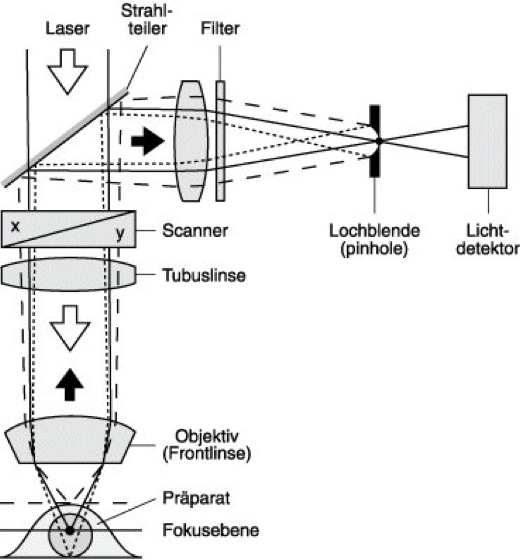 Abb. 1: Schematische Darstellung eines Konfokalmikroskops. Laserlicht wird über einen Scanner durch die Linsen eines Objektivs beugungsbegrenzt auf das Präparat fokussiert. Reflexions- bzw. Emissionslicht aus der Fokusebene und aus darunter- bzw. darüberliegenden Ebenen gelangt über den Scanner zu einem Strahlteiler, wo es aus dem Laserstrahlengang ausgekoppelt wird. Dieses ausgekoppelte Licht wird auf eine extrem kleine Blende (pinhole) fokussiert und trifft nach dem Blendenausgang auf ein Detektionssystem. Aus den im Bild dargestellten Strahlenverläufen des Reflexions- bzw. Emissionslichts wird ersichtlich, daß bei entsprechender Position des pinholes nur Licht aus der Fokusebene die Blende passieren kann, während Licht aus anderen Ebenen des Präparats wirksam unterdrückt wird.