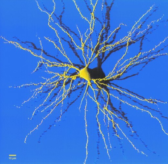 Abb. 2: Konfokale Aufnahme einer mit dem Fluoreszenzfarbstoff Lucifer Yellow angefüllten Nervenzelle aus einer zweiwöchigen organotypischen Kultur des medio-rostralen Neostriatum/Hyperstriatum des Haushuhnkükens. Man erkennt alle Details der Dendritenbäume einschließlich der Dornen.