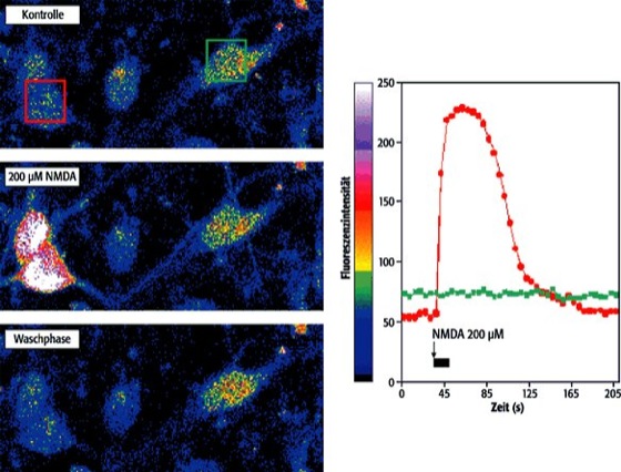 Rechts wird die statistische Auswertung des Fluoreszenzverhaltens einzelner Zellen gezeigt. In den Diagrammen sind die Mittelwerte der Fluoreszenzintensitäten pro Pixel innerhalb der zwei Quadrate, die über zwei individuelle Zellen gezeichnet sind, graphisch dargestellt (Bild links oben). Es wurde eine Serie von Bildern vor, während (schwarzer Balken) und nach NMDA-Behandlung aufgenommen. Die rote Kurve zeigt die Calciumantwort einer NMDA-sensitiven Zelle an, die grüne Kurve die einer NMDA-unsensitiven Zelle.