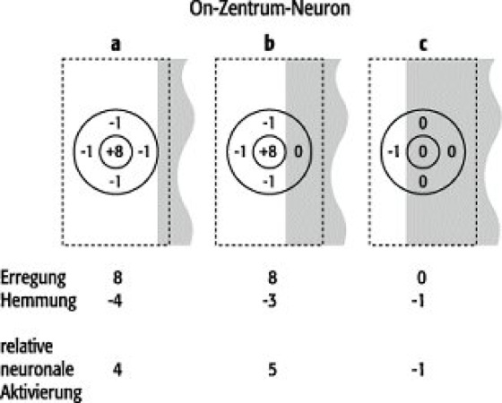 Abb. 3: Die Erregung der On-Zentrum-Neurone ist abhängig von der Position der Hell-Dunkel-Grenze innerhalb der einzelnen rezeptiven Felder. Die fiktiven Zahlen sollen die Verhältnisse von Hemmung und Aktivierung verdeutlichen.