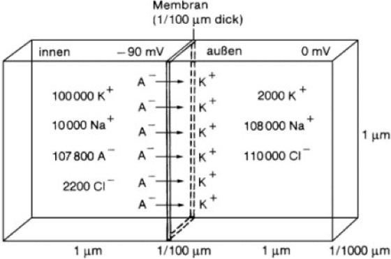 Darstellung eines sehr kleinen Membranstücks von 1 μm × 1/1000 μm Fläche und der angrenzenden intra- und extrazellulären Volumina von je 1 μm × 1 μm × 1/1000 μm Inhalt (angenommenes Membranpotential: -90 mV). Diese Membranfläche ist bei den angegebenen Ionenverteilungen von je 6 K+-Ionen und Anionen (A-) besetzt. Die Pfeile deuten die Diffusion der K+-Ionen durch die Membran aus der Zelle an.