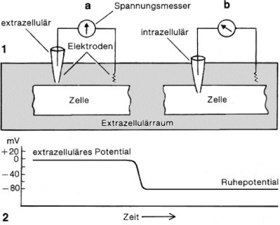 1 Meßanordnung; die Zelle befindet sich in dem mit Plasma oder einer Ersatzlösung gefüllten Extrazellulärraum. a Meß- und Referenzelektrode liegen extrazellulär, Spannung zwischen beiden Elektroden Null; b Meßelektrode intrazellulär, Referenzelektrode extrazellulär, Spannungsmesser gibt das Ruhepotential an. 2 Potential vor und nach Einführen der Mikroelektrode in die Zelle.