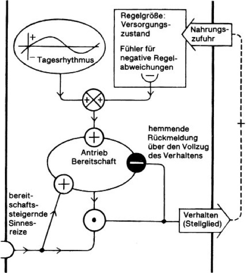 Vereinfachtes, idealisiertes Funktionsschaltbild der Motivation für die Nahrungsaufnahme beim Hund. Das Rechteck stellt die Regelgröße, den Versorgungszustand des Organismus mit Nährstoffen, dar. Das Zeichen für Sinnesorgan (Halbkreis) im Rechteck symbolisiert den Fühler für negative Regelabweichungen, also den Rezeptor, der einen Versorgungsmangel an das Zentralnervensystem meldet. Diese Meldung hat eine Verstärkung der Bereitschaft zur Folge, Nahrung zu suchen und aufzunehmen. Weil sich – wenn dies gelingt – der Versorgungszustand verbessert, entsteht dadurch ein Regelkreis mit negativer Rückkopplung, in dem das Verhalten das Stellglied bildet. Außerdem wirkt schon der bloße Vollzug des Verhaltens (das Fressen oder Schlucken) antriebssenkend, bevor sich die Nährstoffversorgung dadurch verbessert. Es gibt also neben der langsamen Rückkopplung über den Versorgungszustand eine schnelle Rückkopplung über eine laterale Abzweigung. Die schnelle Rückmeldung wird durch die hemmende Abzweigung zur Bereitschaftsinstanz gezeigt. Weiterhin steigern auch Sinnesreize (der Anblick beliebten Futters) die Bereitschaft; bei genügender Attraktivität können sie allein zum Fressen führen, ohne daß eine physiologische Unterversorgung vorliegt. Außerdem wirken noch rhythmische Vorgänge mit, die durch eine weitere Instanz symbolisiert werden, die je nach Tageszeit die Bereitschaft steigert oder senkt (innere Bedingungen des Verhaltens werden durch Ellipsen symbolisiert). Der Kreis mit Punkt stellt ein Koinzidenzglied dar: Es gibt dann eine Meldung weiter, wenn auf beiden Eingangskanälen ein Signal eintrifft (doppelte Quantifizierung).