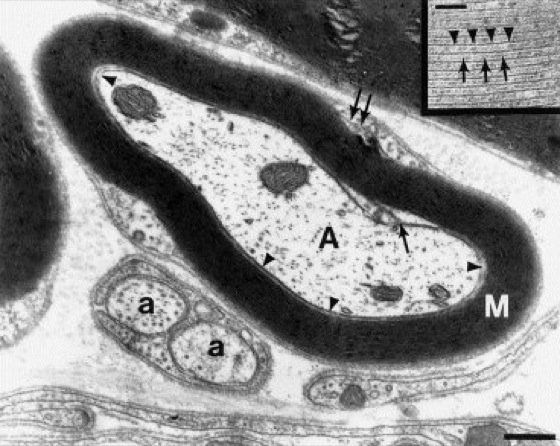 Abb. 1: Elektronenmikroskopische Aufnahme eines quergeschnittenen myelinisierten Axons einer Maus. Der Großteil des Myelins (M) ist kompaktiert und erscheint als breites, dunkles Band, das sich um das Axon (A) legt. Die in dieser Vergrößerung sehr feine Streifung der Myelinscheide entspricht der spiralig verlaufenden Myelinhauptlinie. Der Pfeil zeigt auf das innere Mesaxon, der Doppelpfeil auf das äußere. Die Pfeilspitzen markieren die innere und sehr dünne cytoplasmatische Windung, die direkt dem Axon anliegt. Die mit a gekennzeichneten Strukturen sind nichtmyelinisierte Axone. Balken: 500 nm.