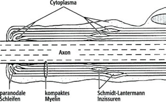 Abb. 2: Schematische Darstellung eines Längsschnitts durch ein myelinisiertes Axon. Neben dem Zellkörper mit Kern enthalten die paranodalen Schleifen und die Schmidt-Lantermann-Inzissuren nicht-kompaktes Myelin (die innerste cytoplasmatische Windung ist nicht dargestellt); der Großteil der Myelinscheide besteht aus kompaktem Myelin.