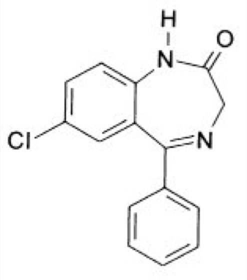 N-Desmethyldiazepams, Metabolit einer Reihe von Benzodiazepinen, der wegen seiner noch vorhandenen Aktivität und der relativ großen Plasma-Halbwertszeit (ca. 120 Stunden) bei der Verabreichung dieser Benzodiazepine berücksichtigt werden muß ( siehe Abb. ). N-Desmethyldiazepam wird z.B. gebildet aus Diazepam, Medazepam, Prazepam, Flurazepam, Chlordiazepoxid.
