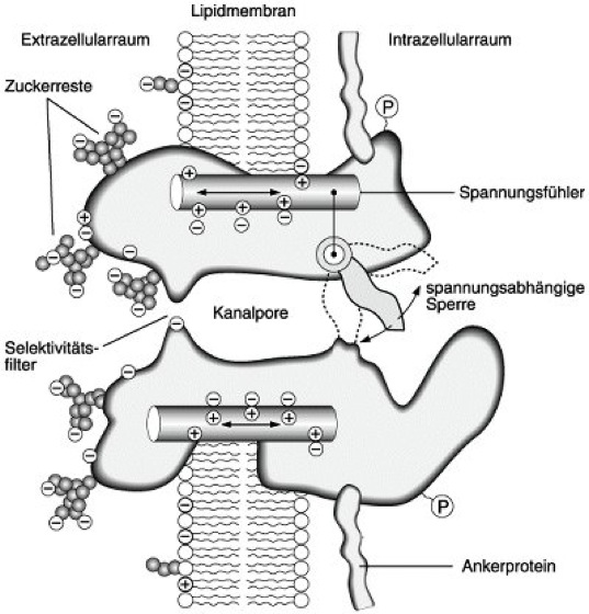 Natriumkanäle [von ägypt. ntry über arab. natun = Lauge(nsalz)], Na+-Kanäle, Natriumionenkanäle, E sodium channels, Ionenkanäle, die überwiegend spannungsabhängig aktiviert werden und für Natrium permeabel sind ( siehe Tab. ). Bei einer Depolarisation der Membran erregbarer Zellen (Nervenzellen, Muskelzellen und neurosekretorische Zellen) kommt es zu einer vorübergehenden Kanalöffnung, bei der Na+-Ionen entlang ihres Konzentrationsgradienten in die Zelle einströmen (Membranpotential; siehe Abb. ). Sowohl die Aktivierung als auch die Inaktivierung erfolgt im Bereich weniger Millisekunden. Nach der Inaktivierung durchläuft ein Kanal eine Refraktärzeit, in der er nicht von neuem aktiviert werden kann: In dieser Zeit erfolgt ein Übergang vom inaktivierten in den geschlossenen Zustand (E closed state). Überschreitet die Depolarisation in diesen Zellen ein bestimmtes Schwellenpotential, kommt es zur Ausbildung eines Aktionspotentials, dessen Kinetik durch die Interaktion der Inaktivierung der Na+-Kanäle und Aktivierung spannungsabhängiger Kaliumkanäle bestimmt wird. Auch in nicht erregbaren Gliazellen (Astrocyten, Schwann-Zellen) wurden Na+-Kanäle beschrieben. – Na+-Kanäle sind einheitlich aus einer α- und zwei β-Untereinheiten aufgebaut. Auf der dem Extrazellulärraum zugewandten Kanalseite sowie in der Kanalpore befinden sich Glykosylierungsstellen. Die α-Untereinheit besteht aus einem Protein mit vier identischen Domänen (E internal repeats), die sich ringförmig zusammenlagern und eine Pore bilden. Jede dieser Domänen weist sechs α-helikale transmembranäre Abschnitte (TM) auf. Die Abschnitte zwischen TM 5 und 6 bilden die Innenwand der Kanalpore. Ein auf TM 4 lokalisierter Spannungssensor (E gating charge) reagiert auf Änderungen des elektrischen Feldes über der Zellmembran mit einer Konformationsänderung und initiiert so die Kanalöffnung. Der Aufbau der α-Untereinheit ist analog den spannungsabhängigen Calciumkanälen; spannungsabhängige Kaliumkanäle sind ebenfalls sehr ähnlich strukturiert. In Xenopus-Oocyten führt die alleinige Expression der α-Untereinheit zur Bildung funktionsfähiger Na+-Kanäle, deren Aktivierungs- und Inaktivierungskinetik jedoch stark verlangsamt und deren Einzelkanalleitfähigkeit um ca. 60% geringer ist als die normaler Kanäle. Erst eine Co-Expression mit der β1-Untereinheit führt zu einer Kinetik und Einzelkanalamplitude nativer Kanäle. Hierin scheint die Bedeutung der β1-Untereinheit zu liegen. Für die über Disulfid-Brücken kovalent gebundene β2-Untereinheit wird eine Rolle bei der Genese sowie bei Transport und Einbau der Na+-Kanäle in die Zellmembran postuliert. – Die Nomenklatur der beschriebenen Na+-Kanal-Typen ist bisher uneinheitlich. Neben den biophysikalischen und molekularbiologischen Eigenschaften bildet die Sensitivität für Tetrodotoxin (TTX, ein Gift aus dem japanischen Kugelfisch) ein Hauptunterscheidungskriterium. TTX-sensitive Na+-Kanäle werden bereits bei Konzentrationen unter 1 μmol/l blockiert, während TTX-resistente Na+-Kanäle erst bei deutlich höheren Konzentrationen inaktiviert werden. Daneben wurden auch spannungsunabhängige Na+-Kanäle beschrieben. Das bekannteste Beispiel ist der Amilorid-sensitive Na+-Kanal in Epithelzellen (epithelialer Natriumkanal). Na+-Kanäle bilden die Zielstruktur von Pharmaka (Anästhetika, Analgetika, Antiarrhythmika, Antiepileptika, Lokalanästhetika).
