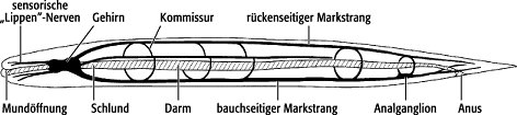 Abb. 8: Nervensystem eines Eichelwurms (Balanoglossus), Seitenansicht, Mittelstück des Körpers weggelassen.