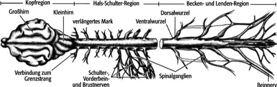 Abb. 9: Die Abbildung zeigt eine Ansicht des Zentralnervensystems und einiger Rückenmarksnerven einer Katze von oben. Der größte Teil des peripheren Nervensystems und die Hirnnerven sind nicht dargestellt, das Rückenmark des Brustbereiches wurde ebenfalls weggelassen. Groß- und Kleinhirn sind so mächtig entwickelt, daß sie alle anderen Hirnteile überdecken und die einzigen in dieser Ansicht sichtbaren Hirnteile sind. Der Cortex des Großhirns ist bei Katzen und manchen anderen Säugern nicht glatt, sondern in Falten gelegt, die man man als Windungen (Großhirnwindungen) bezeichnet. Das Rückenmark ist im Hals/Schulter- und Beckenbereich (dort, wo die motorischen Neurone zur Innervation der mächtigen Extremitätenmuskulatur sitzen) leicht aufgeschwollen (Halsanschwellung, Lendenanschwellung), die Äste der dortigen Spinalnerven verflechten sich zu den Arm- und Beckengeflechten.