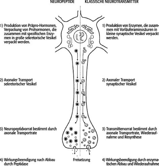 Bei der Synthese von Neuropeptiden (linke Seite) wird bei Stimulation der Nervenzelle über entsprechende Genaktivierung und Transkriptionsprozesse in den Ribosomen ein längeres Prä-Propeptid synthetisiert. In den Golgi-Apparaten werden aus diesem Vorläufer durch proteolytisch wirkende Enzyme peptiderge Prohormone "herausgeschnitten", die dann zusammen mit weiteren, spezifisch wirkenden Enzymen in sekretorische Vesikel verpackt (1) und zur axonalen Endigung transportiert werden (2), wobei die aktiven Neuropeptide hergestellt werden. Im Vergleich zu den nur klassische Transmitter transportierenden Vesikeln sind die Neuropeptide transportierenden Vesikel größer. Die Aktivierung der Neuropeptidfreisetzung ist träger als die der Freisetzung klassischer Transmitter (d.h., sie erfolgt in der Regel erst nach stärkerer Stimulation des Neurons). Nach Freisetzung des Neuropeptids erfolgt die Deaktivierung durch Peptidasen (4). Eine Wiederaufnahme wie bei den klassischen Transmittern besteht nicht. Im Gegensatz zu den klassischen Transmittern können Neuropeptide nicht in der axonalen Endigung resynthetisiert werden; ihre Synthese nimmt immer den längeren Weg über die Produktion von Prä-Propeptiden über den Zellkern. Der Neuropeptidvorrat im Synapsenendigungen wird also allein durch die axonale Transportrate bestimmt (3). Insofern stellt die Informationsübertragung mittels Neuropeptide im Vergleich zu der mittels klassischer, niedermolekularer Transmitter eine langsamere und phylogenetisch ältere Form der interneuronalen Kommunikation dar.