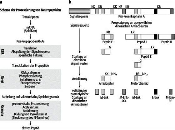 a Schema der ProzessierungvonNeuropeptiden. Nach Genaktivierung und Transkription kann ein Teil der mRNA gespleißt (Spleißen) werden, was zu Sequenzen führt, die nicht direkt auf die Genstruktur zurückzuführen sind. Während der Translation wird das entstehende Präpolypeptid durch die Membran ins Innere des rauhen endoplasmatischen Reticulums (rER) transloziert, wobei N-terminale hydrophobe Signalsequenzen eine Rolle spielen. Anschließend kommt es zu spezifischen Faltungen der Polypeptidkette und Abspaltung der Signalsequenz. Die so gebildeten Propeptide werden in Golgi-Vesikeln eingeschlossen, wo sie weitere Veränderungen durch Glykosylierung, Phosphorylierung, Hydroxylierung, Sulfatierung und ähnliche Reaktionen erfahren. Ferner werden einzelne Propeptide auf spezifische sekretorische oder Speichergranula verteilt. Innerhalb der Granula kann die "Reifung" zu bioaktiven Peptiden weiter ablaufen; hier wirken insbesondere Endo- und Exopeptidasen sowie Reaktionen, die das N- oder C-terminale Ende der Peptide modifizieren.