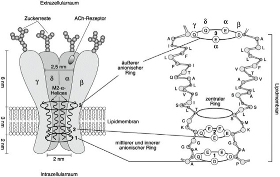 Auf der linken Seite ist das Modell des Pentamers, bestehend aus α-, β-, γ- und δ-Untereinheiten, aus dem elektrischen Organ des Zitterrochens dargestellt. Eine der beiden α-Untereinheiten ist nicht abgebildet. Der extrazelluläre Teil des Kanals bildet einen trichterförmigen Eingang, der sich innerhalb der Lipidmembran verengt (0,65 nm × 0,65 nm). Jede Polypeptidkette der einzelnen Moleküluntereinheiten besteht aus vier transmembranären Segmenten (M1-M5). Wahrscheinlich begrenzt jeweils das Transmembransegment M2 der fünf Untereinheiten die Pore wie eingezeichnet. M2 bildet dabei die räumliche Struktur einer α-Helix, wie auf der rechten Seite der Abb. für die M2-Segmente der β- und γ-Untereinheit gezeigt wird.