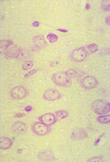 Färbung eines Ausschnitts aus dem Neocortex der Ratte. Neben der Kernfärbung sind die Perikaryen der Nervenzellen dargestellt. Andere Zellen (Gliazellen, Endothelzellen) erscheinen als "nackte" Zellkerne.