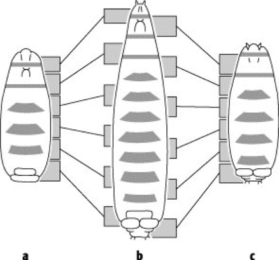 Schematische Darstellung der ventralen Körperoberfläche einer normalen Drosophila-Larve (b) und Ableitung der Phänotypen der Mutanten fushi tarazu (a) und paired (c). Die Körperoberfläche der Mutante setzt sich jeweils aus den mit Raster markierten Streifen der Körperoberfläche des Wildtyps zusammen.