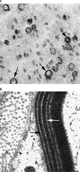 1 IgM-Ablagerungen (Pfeile) auf Nervenfasern