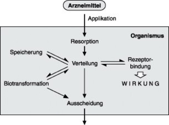 Unter den verschiedenen Applikationsformen ermöglicht die parenterale (unter Umgehung des Verdauungstrakts – meist intravenös) eine sehr exakte Dosierung und einen raschen Wirkungseintritt. Am häufigsten ist jedoch die orale Arzneimittelapplikation, z.B. als Tablette. Ausmaß und Geschwindigkeit der anschließenden Resorption im Organismus, d.h. die Aufnahme aus dem Verdauungstrakt in den Blutkreislauf, sind abhängig von den chemisch-physikalischen Eigenschaften der einzelnen Substanzen und der Zubereitung der Substanz. Ein Maß für die Resorptionsquote ist die Bioverfügbarkeit, die für intravenös gegebene Substanzen definitionsgemäß 100% beträgt und bei oraler Gabe nach Messung der Blutplasmaspiegel dazu ins Verhältnis gesetzt wird. Durch den first pass effect werden viele Substanzen nach Resorption aus dem Magen-Darm-Trakt direkt zur Leber geleitet und dort der Biotransformation zugeführt, d.h. durch Stoffwechselprozesse in ihrer Wirkung meistens abgeschwächt oder vollkommen inaktiviert. Für Barbiturate kann nach wiederholter Gabe diese Biotransformation durch Enzyminduktion gegenüber der erstmaligen Gabe wesentlich erhöht sein. Ein Maß für die Diffusion der Substanzen aus dem Blutkreislauf ins umgebende Gewebe ist ihre Verteilung, die ihrerseits abhängig ist von der Molekülgröße der Substanz, der Fett- oder Wasserlöslichkeit und der Bindung an Gewebs- oder Plasmaproteine. Im Gehirn entscheiden diese Eigenschaften, ob ein Wirkstoff die Blut-Hirn-Schranke überwinden kann oder nicht. Die quantitative Messung der Wirkstoffkonzentration im Blutplasma zu verschiedenen Zeitpunkten liefert charakteristische Plasmaspiegelkurven. Daraus lassen sich weitere pharmakokinetische Kenngrößen berechnen. Maximalspiegel und der zugehörige Zeitpunkt geben Aufschluß über den Verlauf der Resorption. Daraus kann weiterhin die Halbwertszeit ermittelt werden, d.h. die Zeit, die benötigt wird, damit sich der Plasmaspiegel einer Substanz halbiert. Ein Maß für die Ausscheidungskraft des Körpers ist die clearence. Wesentlichen Anteil an der Gesamtclearence des Körpers haben Niere und Leber, aber auch durch Abatmung oder Schwitzen können Substanzen ausgescheiden werden. Eine verminderte Arzneimitteldosierung ist bei Patienten mit Niereninsuffizienz oder Leberfunktionsstörungen indiziert.