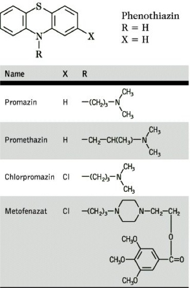 Phenothiazine, Phenothiazin-Derivate, vom Phenothiazin (ein Anthelminthikum) abgeleitete Neuroleptika, Antiemetika, Antihistaminika, Antiallergika, Sedativa, Antiparkinsonmittel und Psychopharmaka ( siehe Abb. ). Die Phenothiazine besitzen ein Grundgerüst, das aus drei Ringen aufgebaut ist. Nach der Substitution dieses Grundgerüstes unterscheidet man drei Gruppen: 1) Phenothiazine mit aliphatischer Seitenkette: diese wirken stark sedativ, ihre Nebenwirkungen liegen vor allem im vegetativen Bereich; Vertreter sind z.B. Chlorpromazin, Profenamin, Promazin, Promethazin, Triflupromazin. 2) Phenothiazine mit Piperidyl-Seitenkette (Pecazin-Typ): diese wirken mittelstark sedierend; Vertreter sind z.B. Periciazin, Thioridazin. 3) Phenothiazine mit Piperazinyl-Seitenkette (Perphenazin-Typ): diese wirken nur schwach sedativ und antihistaminisch, aber sehr stark antipsychotisch und antiemetisch; ihre Nebenwirkungen liegen vor allem im Bereich der extrapyramidalen Symptome; Vertreter sind z.B. Fluphenazin, Perphenazin, Trifluoperazin und Metofenazat (Methophenazin).