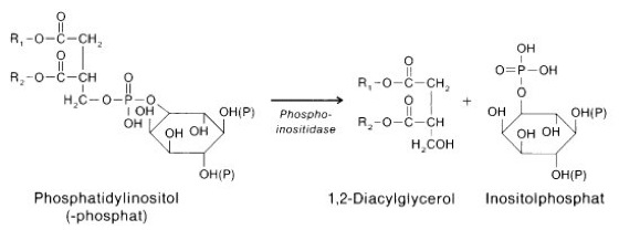 Die durch die Phospholipase C (= Phosphoinositidase) katalysierte Reaktion. (P) bedeutet, daß die Moleküle an diesen Positionen Phosphatgruppen tragen können.