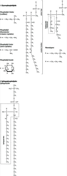 Phospholipide unterteilen sich in die von Glycerin abgeleiteten Phosphoglyceride und die von Sphingosin abgeleiteten Sphingosinphosphatide (Sphingomyeline). Die Fettsäureketten sind bei beiden Typen in der Zahl der C-Atome in der Regel geradzahlig und unverzweigt; neben gesättigten sind besonders in den C2-Positionen der Phosphoglyceride auch ungesättigte Fettsäurereste mit cis-Doppelbindungen enthalten.