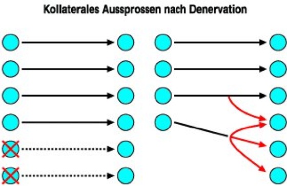 Abb. 1: Kollaterales Aussprossen: Bei Denervation von Nervenzellen können die Axone der verbleibenden benachbarten Zellen neue Kollateralen bilden (rote Pfeile), welche die denervierten Zielzellen reinnervieren.