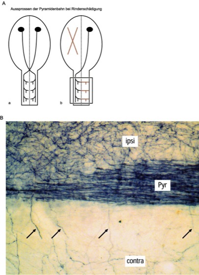 Hier wurden nach einer Läsion der Pyramidenbahn einer Seite die Fasern der verbliebenen Pyramidenbahn mit einem Tracer markiert (Pyr, dunkle Markierung). Einige Fasern, die normalerweise nur die ipsilaterale Seite des Rückenmarks (ipsi) innervieren, bilden neue Kollateralen (Pfeile), die im rechten Winkel abgehen, über die Mittellinie hinweg wachsen und die denervierte Seite (contra) re-innervieren.