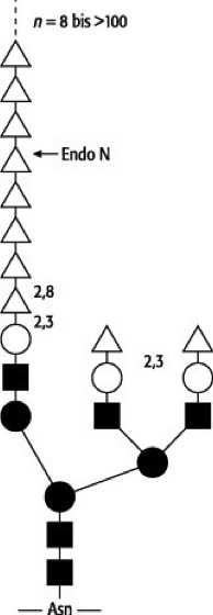 Struktur von Polysialinsäure, die über eine typische N-Glykosylierung an NCAM gebunden ist. Dreiecke: Sialinsäure; weiße Kreise: Galactose; schwarze Quadrate: Glucosamin: schwarze Kreise: Mannose.