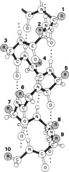 Ansicht des "gefalteten Blatts" in der Perspektive. Die Aminosäureseitengruppen (R) stehen abwechselnd oberhalb und unterhalb der Blattstruktur; allzu große Seitengruppen behindern die Ausbildung der Faltblattstruktur