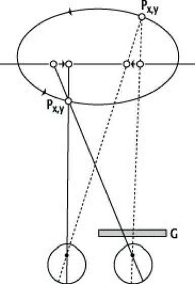 Das Gehirn "errechnet" jeden Punkt Px,y der (hypothetischen) Pendellaufbahn aus den Bildern beider Augen, d.h., es vermutet das Pendel genau dort, wo sich die Sehachsen beider Augen kreuzen. Da das mit dem Graufilter (G) versehene Auge jedoch eine im Gegensatz zum freien Auge zeitlich verzögerte Information liefert, entstehen Disparitäten des Pendelbildes auf beiden Netzhäuten: es entsteht der Eindruck, das Pendel würde auf einer ellipsoiden Bahn schwingen. Dabei ist die Schwingungsrichtung der Ellipsenbahn davon abhängig, vor welchem Auge sich das Graufilter befindet (rechtes Auge: gegen den Uhrzeigersinn, linkes Auge: im Uhrzeigersinn) und die Breite der Ellipse von der Stärke des Filters (je heller das Filter, desto flacher die Bahn).