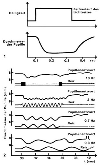 Die Pupille des menschlichen Auges hat bei starkem Lichteinfall einen kleinen, bei schwachem Lichteinfall einen großen Durchmesser. Dadurch trifft bei starker Beleuchtung ein kleinerer Teil des Lichts auf die Netzhaut als bei schwacher (vergleichbar der Blendenregulierung beim Photoapparat). 1 Bei einem plötzlichen Anstieg des Lichteinfalls (Sprungfunktion) verengt sich die Pupille allmählich; bei Verminderung des Lichteinfalls wird sie allmählich weiter. 2 Fällt Licht in das Auge, dessen Intensität sinusförmig schwankt, so folgt die Pupillenreaktion bei sehr niedriger Reizlichtfrequenz der Intensitätsänderung mit einer gewissen Verzögerung. Je höher die Reizlichtfrequenz ist, desto schwächer wird die Pupillenreaktion, bis schließlich bei hoher Frequenz keinerlei Reaktion mehr zu erkennen ist.