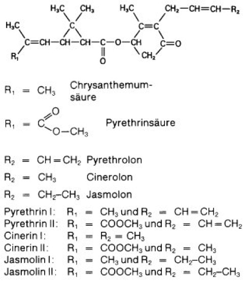 Pyrethrine [von griech. pyrethron = scharfschmeckende Kamille], E pyrethrines, in verschiedenen Chrysanthemum-Arten natürlich vorkommende, in Insekten neurotoxisch (und damit insektizid) wirkende Inhaltsstoffe ( siehe Zusatzinfo ; siehe Abb. ). Der Wirkungsmechanismus der Pyrethrine und ihrer synthetischen Analoga, der Pyrethroide (z.B. Allethrin, Resmethrin,Tetramethrin), beruht auf einer Modifikation der Funktion des spannungsaktivierten Natriumkanals in Nervenzellen.