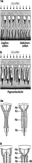 1 Schnitt durch die Retina eines Weißfisches, a bei Hell-, b bei Dunkeladaptation. 2a Retinomotorik beim Superpositionsauge vieler Käfer und Schlammfliegen, b beim Appositionsauge einiger Kurzflügler und Wanzen (links jeweils dunkel-, rechts helladaptiert). Hz Hauptpigmentzelle, Kz Kristallgelenkzelle, Nz Nebenpigmentzelle, Rh Rhabdomer, Rz Retinulazelle.