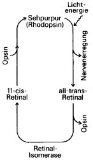 Rhodopsins [von griech. rhodon = Rose, opsis = Sehen], Sehpurpur, Erythropsin, E rhodopsin, Bezeichnung für die visuellen Pigmente (Augenpigmente, Sehfarbstoffe) in den Sehzellen (Photorezeptoren) der Netzhaut der meisten Wirbeltiere. Das Rhodopsin aus den Stäbchen der Säugetiere stellt den bestuntersuchten Vertreter der Rhodopsine dar. Das lichtempfindliche, aus einem Chromophor (Retinal) und einer Proteinkomponente (Opsin) zusammengesetzte Chromoprotein ist in hoher Konzentration in den Membranstapeln (E discs) der Stäbchen-Außensegmente vorhanden. Rhodopsin dient als Lichtsensor, das den einfallenden Lichtreiz in eine chemische Reaktion (Photoisomerisierung des Retinals) und letztlich in ein elektrisches Signal (Phototransduktion;Photorezeption) umsetzt ( siehe Abb. ). Das Primaten-Stäbchen-Rhodopsin weist ein Absorptionsmaximum um 500 nm (maximale Empfindlichkeit für grünes Licht) auf, die Zapfen-Rhodopsine haben Absorptionsmaxima bei 430, 535 und 565 nm (Farbensehen). Sehschwelle, Transducin.