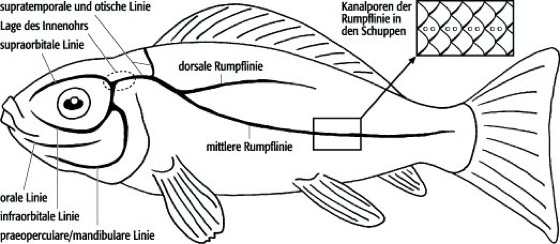 Seitenlinienorgane, Seitenorgane, Seitenlinie, Lateralisorgane,Elateral line organs, ein bei allen Fischen und im Wasser lebenden Amphibien an Kopf und Rumpf vorkommendes System von Sinnesorganen und deren Hilfseinrichtungen, das der Wahrnehmung von Wasserströmungen (Strömungssinn), Druckschwankungen sowie von elektrischen Feldern dient ( siehe Zusatzinfo 1 ). Man unterscheidet daher mechanorezeptive und elektrorezeptive Seitenlinienorgane (elektrosensorisches System). Die mechanosensorische Seitenlinie trägt als Rezeptoren sog. Neuromasten ( siehe Abb. 1 ). Ein Neuromast besteht aus nicht-nervösen Stützzellen und 20-30 cilientragenden Haarzellen. Jede dieser Haarzellen trägt ein Stereocilium und mehrere Kinocilien. Alle Cilien sind in eine gemeinsame Cupula (Gallerthaube) eingelassen. Sowohl die einzelnen Zellen als auch der Neuromast insgesamt sind polarisiert, d.h., sie sprechen bevorzugt auf Auslenkungen der Cupula in eine bestimmte Richtung an. Bei Neunaugen und manchen Amphibien liegen die Neuromasten in Reihen frei an der Oberfläche des Körpers, bei Knorpel- und Knochenfischen sinken sie in (teilweise knöchern umschlossene) Kanäle hinab, deren wassergefülltes Lumen über regelmäßig angeordnete Poren mit der Außenwelt in Verbindung steht. Diese Kanäle und Poren sind dann als die Linien auf dem Fischkörper erkennbar, die dem gesamten System seinen Namen gegeben haben ( siehe Abb. 2 ). Das Muster dieser Linien ist artspezifisch, aber zwischen verschiedenen Arten sehr variabel. – Die Neuromasten der Seitenlinie des Rumpfs und des Kopfes, ebenso wie die Ganglienzellen der Nerven, die deren Informationen den sensorischen Seitenlinienkernen des Myelencephalons zuleiten, gehen aus eigenen embryonalen Plakoden hervor, von denen es ursprünglich wohl sechs Paare gibt. Entsprechend entstehen ontogenetisch auch bis zu sechs – ursprünglich selbständige – Paare von sensorischen Seitenliniennerven und -ganglien, die allerdings später meist mit den anderen, benachbarten Hirnnerven (V, VII, IX, X) des Metencephalons und Myelencephalons und deren Ganglien verschmelzen. Früher schlug man diese Seitenlinienafferenzen als "speziell somatosensorische Komponente" zu diesen Hirnnerven vor. Heute hat es sich eingebürgert, die hinter der Ohrkapsel austretenden (postotischen; ursprünglich drei) Seitenliniennerven zusammenfassend als Nervus posterior lineae lateralis (E posterior lateral line nerve) und die präotischen (ebenfalls ursprünglich drei) entsprechend als Nervus anterior lineae lateralis zu bezeichnen. Das gemeinsame Zielgebiet der mechanorezeptiven Seitenliniennerven im Myelencephalon ist der Nucleus medialis areae octavo-lateralis. Er liegt in der Flügelplatte des Myelencephalons, ventral des Zielkerns der elektrosensorischen Anteile der Seitenlinie. Er ist stets von dem unter ihm liegenden Zielkern des Innenohrs (Nucleus ventralis areae octavo-lateralis), der die Informationen der Haarzellen des Innenohrs verarbeitet, deutlich getrennt ( siehe Zusatzinfo 2 ).
