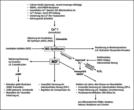 Stickoxids, Stickstoffmonoxid, Stickstoff(II)oxid, NO, E nitric oxide, ein gasförmiges Radikal (NO·), das auf enzymatischem Wege (Stickoxid-Synthase) im gesamten Organismenreich produziert und vielfältig als Biosignal wie auch als "Killerstoff" eingesetzt wird. Die Entdeckung, daß der dem Endothel entstammende, gefäßdilatierende Faktor ("endothelium derived relaxing factor", EDRF) mit NO identisch ist und über eine Aktivierung der Guanylatcyclase (Erhöhung der cGMP-Konzentration) wirksam wird, löste eine stürmische Entwicklung der NO-Forschung aus (Science-Umfrage 1992: "molecule of the year"; 1998 Nobelpreis an F. Murard, R.F. Furchgott und L.J. Ignarro für deren Pionierarbeiten). Dabei wurde zunehmend deutlich, daß es kaum einen physiologischen oder pathophysiologischen Prozeß gibt, der nicht wenigstens indirekt durch NO beeinflußt wird ( siehe Abb. ). – Direkt metabolisch wirksam ist NO neben seiner Aktivierungsfähigkeit für die Guanylatcyclase durch Hemmung verschiedener Enzyme: u.a. Glyceraldehyd-3-phosphatdehydrogenase, cis-Aconitase, Ribonucleotid-Reductase und Elektronentransportproteine der Atmungskette. Einmal gebildet, diffundiert NO frei durch das Gewebe, durch Zellmembranen offenbar nicht behindert. Sein Aktionsradius wird allerdings durch Reaktion mit Fänger-Molekülen (unter anderem Hämgruppen, so vor allem durch das Hämoglobin des Blutes, aber auch SH-Gruppen und Superoxid) begrenzt und ist für das Gewebe des Zentralnervensystems auf wenige Zelldurchmesser zu veranschlagen. Über Intermediärprodukte wird NO schließlich zu Nitrit und Nitrat oxidiert. Ein vor allem pathophysiologisch wichtiges NO-Derivat ist das Peroxynitrit (ONOO-), das sich in Form einer Adduktionsreaktion spontan und mit extrem hoher Geschwindigkeit aus NO und dem Superoxid-Radikal (O2·-) bildet (reaktive Sauerstoffspezies). Peroxynitrit hat gegenüber NO ein weit höheres oxidatives und zugleich auch toxisches Potential. – Im Nervengewebe sind drei NO-Quellen von besonderer Bedeutung: Nervenzellen, Endothelzellen und Mikrogliazellen. Die Fähigkeit, NO zu synthetisieren, ist für Neuronen der Wirbeltiere je nach Ausstattung mit der neuronalen Isoform der Stickoxid-Synthase sehr unterschiedlich ausgeprägt. Von Neuronen des peripheren Nervensystems wird NO in einer transmitterähnlichen Funktion freigesetzt, so von Nervenendigungen der NANC-Neuronen in den Wänden von Gefäßen und Bronchien (Dilatation durch Erschlaffung der glatten Muskulatur) oder in peripheren Organen zur Steuerung der Sekretproduktion. Das gastroenterale Nervensystem verfügt über auffallend viele NO-bildende Neuronen, die die Darmmotilität und die Sekretion steuern. Im Zentralnervensystem gibt es Regionen mit hoher Dichte an NO-positiven Neuronen, so in der Kleinhirnrinde und in einigen Kerngebieten des Hirnstamms. NO übernimmt hier vermutlich ebenfalls eine Neurotransmitter-Funktion. Im übrigen sind die NO-bildenden Neuronen über alle Hirnregionen hin schütter verteilt (1-2% der Neuronen). Ihre Fortsätze bilden jedoch ein extrem dichtes Fasernetz, das das gesamte Gehirn und Rückenmark durchzieht und vermutlich für die aktivitätsabhängige Steuerung der regionalen Durchblutung zuständig ist. Inwieweit NO als "retrograder Transmitter" an Langzeitpotenzierung und Langzeitdepression beteiligt ist, bedarf der weiteren Klärung. Ein neuromodulatorischer Effekt durch Beeinflussung der Transmitterfreisetzung (Glutamat, GABA, Dopamin) hingegen ist sehr wahrscheinlich. Auch wird dem NO eine Rolle bei der Bildung von Synapsen und der Angiogenese zugeschrieben. Neueren Erkenntnissen zufolge kann NO auch Apoptose verhindern, indem es Caspasen bindet und inaktiviert. – Gegenstand intensiver Forschung ist die Rolle von NO und seinen Folgeprodukten, vor allem des Peroxynitrits, bei neuropathologischen Prozessen, so bei neurodegenerativen Vorgängen (akut durch Ischämie, Hypoxie und Hypoglykämie, z.B. als Folge eines Schlaganfalls, wie auch chronisch bei primär neurodegenerativen Erkrankungen, u.a. Alzheimer-Krankheit und Parkinson-Krankheit, Chorea Huntington, amyotrophe Lateralsklerose), ferner bei Entzündungen, chronischen Schmerz-Zuständen, Migräne, Sucht-Entwicklung und Tumor-Bildung. Wichtigste Gegenspieler von NO und Peroxynitrit sind antioxidative/antinitrosative Schutzsysteme enzymatischer (z.B. Superoxid-Dismutase) und nicht-enzymatischer Art (Glutathion und andere Sulfhydrylverbindungen, Vitamin C und Vitamin E, ungesättigte Fettsäuren). – Für eine Reihe wirbelloser Tiere, vor allem Arthropoden, (Limulus, Drosophila melanogaster, Heuschrecken, Raubwanzen) ist ebenfalls eine neuronale NO-Produktion erwiesen. Neben cGMP-abhängigen werden auch cGMP-unabhängige Mechanismen bei der NO-vermittelten Neurotransmission diskutiert. – Mäuse mit einem Mangel an NO weisen auch ein verändertes Verhalten auf; vor allem das gezeigte Maß an Aggressivität zu verschiedenen Zeiten (z.B. während und nach einer Schwangerschaft) scheint betroffen zu sein. freie Radikale.