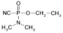 Tabuns,Etabun, Nervengas, das über die Haut, Nahrung und Atmung in den Körper aufgenommen wird. Es handelt sich um ein Organophosphat, das auch hirngängig ist ( siehe Abb. ). Tabun besitzt eine LD50 von 0,08 mg/kg Körpergewicht. Außerhalb des Körpers ist Tabun nicht persistent. Es reagiert mit dem Wasser in der Luft und wird dadurch innerhalb von Tagen bis Wochen inaktiviert. Tabun hemmt die Acetylcholin-Esterase. Vergiftungen mit Tabun äußern sich durch Nervosität, Angst, Sprachstörungen, Benommenheit, Blutdrucksteigerung, Vasokonstriktion, Störung der Herzfunktion (negativ chronotrop), Krämpfe, Atemdepression (bis zum Atemstillstand), gesteigerte Bronchialsekretion, Störungen der Magen- und Darmfunktion (Durchfall, Erbrechen) und Schweißausbrüche. Die Therapie einer Vergiftung erfolgt symptomatisch mit Atropin sowie durch Reaktivierung der Acetylcholin-Esterase (z.B. mit 2-PAM [Pyridin-2-aldoxim-methoiodid oder Toxogonin]). Acetylcholin-Esterase-Hemmer.