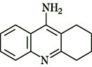 Tacrins, E tacrine, Substanz, die in den USA zur Behandlung der Alzheimer-Krankheit zugelassen wurde ( siehe Abb. ). Tacrin hemmt wie Donepezil den Abbau von Acetylcholin (ein zentral wirksamer, reversibler Acetylcholin-Esterase-Hemmer) und bewirkt dadurch eine Verbesserung der Symptomatik. Sie erhöht das Erinnerungs- und Konzentrationsvermögen sowie die allgemeine geistige Leistungsfähigkeit, jedoch verliert sich diese Wirkung nach relativ kurzer Therapiedauer wieder. Eine Heilung der Krankheit wird nicht erreicht. Bei der Behandlung mit Tacrin kann es zu gastrointestinalen Störungen (Übelkeit, Erbrechen, Durchfall) sowie zu Leberfunktionsstörungen kommen. Galanthamin, Nootropika.