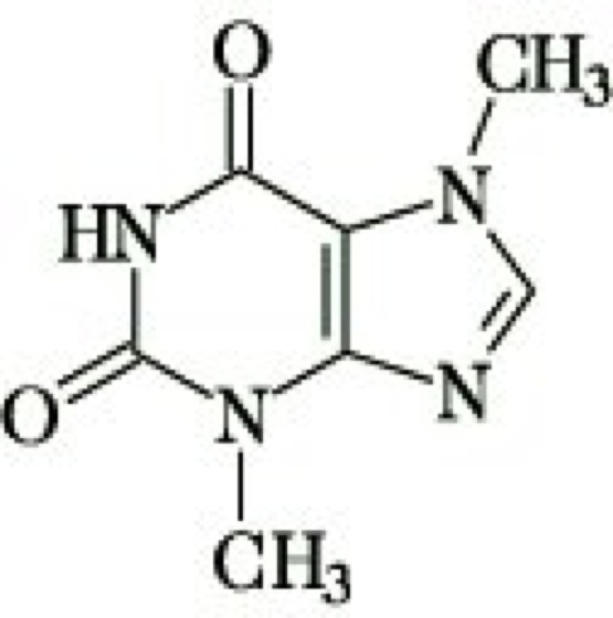 Theobromins [von griech. theos = Gott, broma = Speise], 3,7-Dimethylxanthin, Etheobromine, ein in zahlreichen Pflanzenarten (vor allem in Kakaobohnen, zu 1-4%) vorkommendes Methylxanthin-Derivat (ein Purinalkaloid; siehe Abb. ). Seine anregende Wirkung ist ähnlich der, jedoch weniger stark als die des Coffeins. Theobromin wird als Diuretikum und als zentrales Anregungsmittel für Herz und Kreislauf eingesetzt.