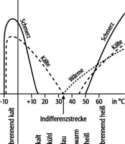 Ansprechen verschiedener Hautrezeptoren und Ausbildung der entsprechenden Empfindungen in Abhängigkeit von der Temperatur beim Menschen. Die Indifferenzstrecke bezeichnet den Temperaturbereich (beim unbekleideten, ruhenden Menschen ca. 33 °C), bei dem keine Temperaturempfindung auftritt.