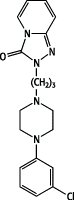 Trazodons, Etrazodone, ein atypisches Antidepressivum, das sich als Phenylpiperazin-Derivat ( siehe Abb. ) in seiner chemischen Struktur von den tricyclischen Antidepressiva und den MAO-Hemmern unterscheidet. Es hemmt selektiv und schwach die Serotonin-Aufnahme und besetzt Serotoninrezeptoren und α-adrenerge Rezeptoren. Trazodon wirkt antidepressiv, sedierend und verändert den REM-Schlaf.