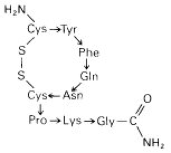 Vasopressins [von latein. vas = Gefäß, pressus = gedrückt], Adiuretin,antidiuretisches Hormon (Abk. ADH), Evasopressin, zyklisches Peptidhormon (Neuropeptide) des Hypothalamus mit 9 Aminosäuren (Strukturaufklärung und Synthese 1953/54 von V. du Vigneaud; siehe Abb. ), das zusammen mit Oxytocin einem gemeinsamen Vorläufer-Molekül entstammt. Vasopressin wird im Nucleus paraventricularis und im Nucleus supraopticus des Hypothalamus synthetisiert und gelangt von dort, gebunden an ein größeres Polypeptid (Neurophysin), durch axonalen Transport über den Tractus supraopticohypophyseus in den Hypophysenhinterlappen (Neurohypophyse; Hypophyse). Dort wird es wie in einem Neurohämalorgan in Sekretgranula gespeichert und bei Erregung der neurosekretorischen Zellen direkt in den Körperkreislauf freigesetzt (Hypothalamus-Hypophysen-System). Ausgelöst wird die Vasopressinausschüttung durch die Erregung von Osmorezeptoren, die zum Teil mit den Nervenzellen des Hypothalamus identisch sind, teils in der Leber lokalisiert sind. Vasopressin bewirkt durch Erhöhung des Spannungszustands der glatten Muskulatur eine anhaltende Blutdrucksteigerung, regt die Dünndarmmuskulatur an und erhöht die Wasserrückresorption in der Niere. Der normale Blutspiegel im Menschen beträgt 2-6 pg/ml Serum bei einer Halbwertszeit von etwa 8 min. Bei Unterproduktion oder Zerstörung des Hypophysenhinterlappens werden sehr große Mengen sehr dünnen Harns ausgeschieden (Diabetes insipidus, Wasserharnruhr), eine Krankheit, die durch Gaben von Vasopressin behoben werden kann. Hypothalamisches Vasopressin stimuliert im Hypophysenvorderlappen gemeinsam mit Corticoliberin die Freisetzung von ACTH (adrenocorticotropes Hormon). Vasopressinhaltige Neuronenverbindungen ziehen außerdem von den genannten hypothalamischen Kernen zu verschiedenen Kernen des Hirnstamms (Locus coeruleus, dorsaler Raphekern, Teile der Formatio reticularis). Neben dem Nucleus suprachiasmaticus, einem Hypothalamuskern, der circadiane Rhythmen reguliert, wird Vasopressin zentralnervös außerdem in mehreren extrahypothalamischen, vor allem limbischen Regionen (Stria terminalis, laterales Septum, mediale Kerne der Amygdala) synthetisiert. Zu den Zielregionen vasopressinerger Fasern gehört vor allem der Hippocampus. Eine Stimulation der Vasopressinfreisetzung erfolgt bei hyposmolaren Bedingungen und bei Streß. – Zentralnervös ist Vasopressin unter anderem an der Entstehung des Durstgefühls beteiligt (Durst). Über Einflüsse auf septo-hippocampale Strukturen wird durch Vasopressin bei Tier und Mensch die Gedächtnisleistung (Gedächtnis), insbesondere die Gedächtnisencodierung, verbessert. Dem Vasopressin wird außerdem eine Funktion bei der Gehirnentwicklung zugesprochen. Vom Nucleus suprachiasmaticus ausgehende Vasopressinwirkungen sind wahrscheinlich für eine Beeinflussung des Schlaf-Wach-Rhythmus (Schlaf) durch das Peptid verantwortlich. Insbesondere alte Menschen, bei denen der Vasopressingehalt im Nucleus suprachiasmaticus verringert ist, und Menschen mit Depressionen zeigen einen gestörten Wach-Schlaf-Rhythmus mit verkürzten Tiefschlafphasen. Bei diesen Menschen hat Vasopressin offenbar einen günstigen Einfluß auf die gestörte Schlafarchitektur und vor allem auf die Tiefschlafphasen – ganz im Gegensatz zu klassischen Schlafmitteln (Hypnotika). siehe Zusatzinfo . Hormone, Vasopressinrezeptoren.