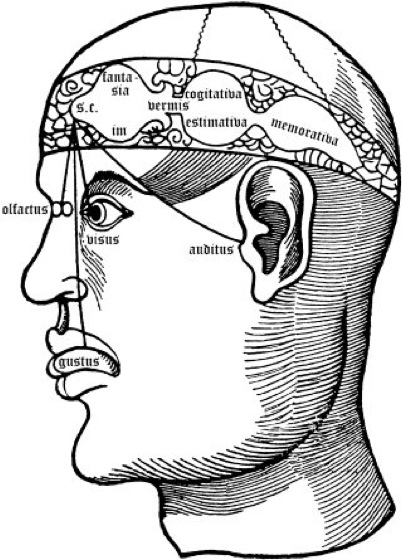Ventrikeltheoriew [von latein. ventriculus = kleiner Bauch],E ventricle theory, frühere Vorstellung über die Hirnventrikel als Sitz der Seele. Geprägt von einem dualistischen Weltbild (Dualismus), in dem der Körper Materie darstellte und die Seele (Geist) amateriell war, bestand die Vorstellung, daß die Hohlräume des Gehirns der Sitz des Geistes seien (Leib-Seele-Problem). In Analogie zur Dreifaltigkeit wurde ein dreiteiliges Ventrikelsystem postuliert ( siehe Abb. ). Der erste, vorderste Ventrikel beherbergte die Sinnesorgane und die Fantasie, der zweite, mittlere Ventrikel die Gedanken (Denken) und damit die Vernunft und der dritte, hinterste Ventrikel das Gedächtnis. Noch bei Leonardo da Vinci findet sich in sonst detailgenauen Zeichnungen ein dreigeteiltes Ventrikelsystem. Erst in den anatomischen Zeichnungen von Andreas Vesalius sind vier Ventrikel dargestellt. Geschichte der Hirnforschung.