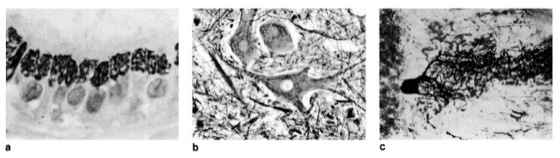 c Purkinje-Zellen (aus dem Kleinhirn) mit Ausläufern, versilbert