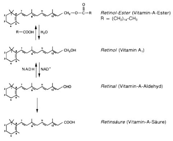 Retinol, Retinal und Retinol-Ester sind durch Gleichgewichtsreaktionen ineinander überführbar; aus Retinal entsteht Retinsäure.