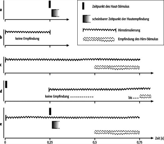 a Ein Stimulus auf der Haut wird scheinbar kurz nach der tatsächlichen Reizung wahrgenommen. b Ein corticaler Stimulus, der weniger als 0,5 s dauert, wird nicht wahrgenommen. c Hält ein corticaler Stimulus länger an, wird er 0,5 s nach seinem Beginn wahrgenommen. d Ein solcher langanhaltender corticaler Reiz kann einen früher erfolgten Haut-Reiz rückwirkend maskieren; daraus wird geschlossen, daß der Haut-Stimulus zur Zeit des corticalen Stimulus noch nicht bewußt war. e Erfolgt ein Haut-Stimulus kurze Zeit nach einem corticalen Stimulus, wird das Bewußtsein des Hautreizes zurückdatiert, das Bewußtsein des corticalen Reizes jedoch nicht. Daraus wurde geschlossen, daß unser Gehirn unsere Wahrnehmungen umdatiert; diese Deutung ist aber noch nicht allgemein akzeptiert.